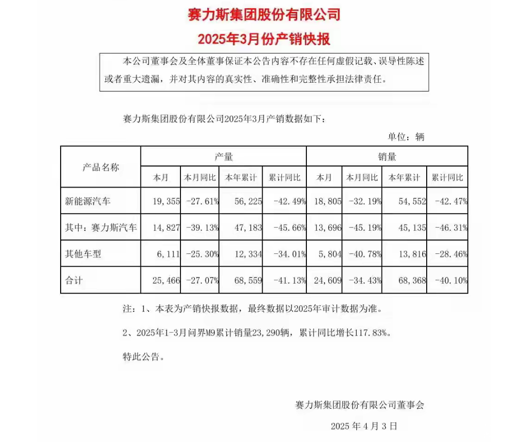4月3日,赛力斯集团发布产销快报,数据显示,2025年3月,赛力斯新能源汽车单月销量同比下滑32.19%至18,805辆;1-3月份销量为54552台,同比下滑了42.47%,呈现出一定的同比下滑态势。