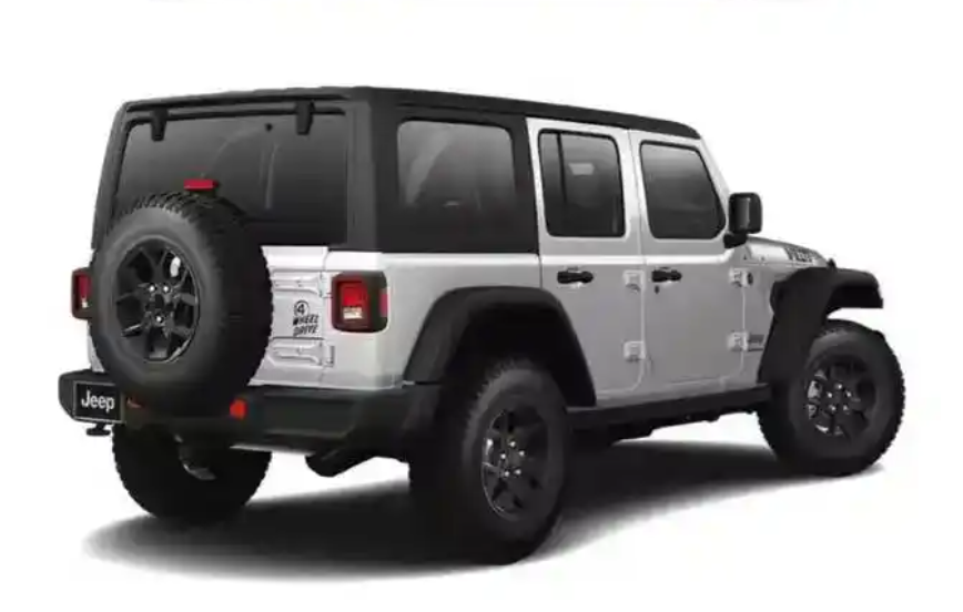车身侧面设计延续了牧马人家族的方正硬派风格,搭配尺寸较小的17英寸黑色轮辋,进一步突出了越野特点。轮毂经过熏黑处理,大尺寸设计使其显得更加霸气。车辆尾部设计同样硬朗,标志性的外挂式备胎和黑色处理的后保险杠,彰显出强大的越野气息。