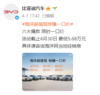 4月3日,比亚迪通过官方微博发布消息,针对2025款宋PLUS DM-i、海豹06 DM-i、驱逐舰05荣耀版等六大爆款车型,实行限时一口价,售价最低5.68万元。