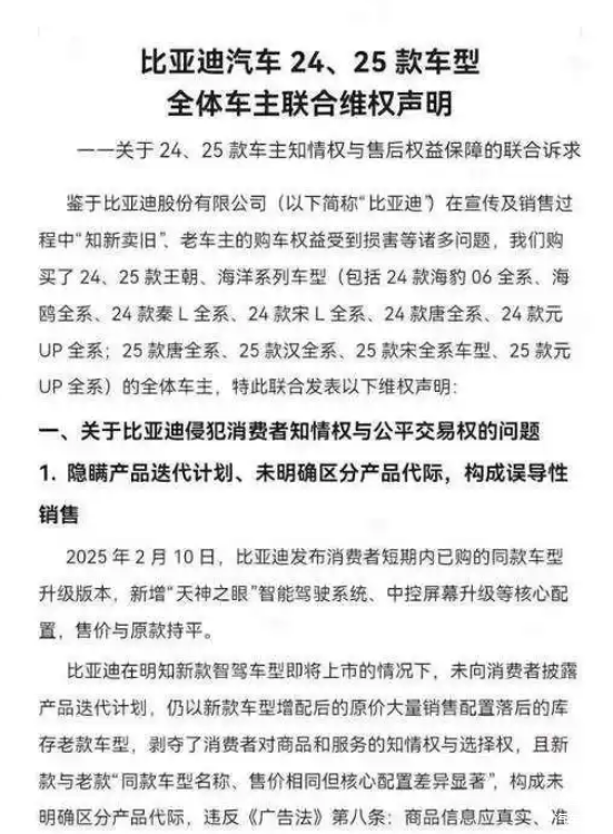 众多购买了老款车的车主们进行联合维权,要求比亚迪正视问题,承担企业责任,采取诸如公开致歉,提供相应补偿等措施。