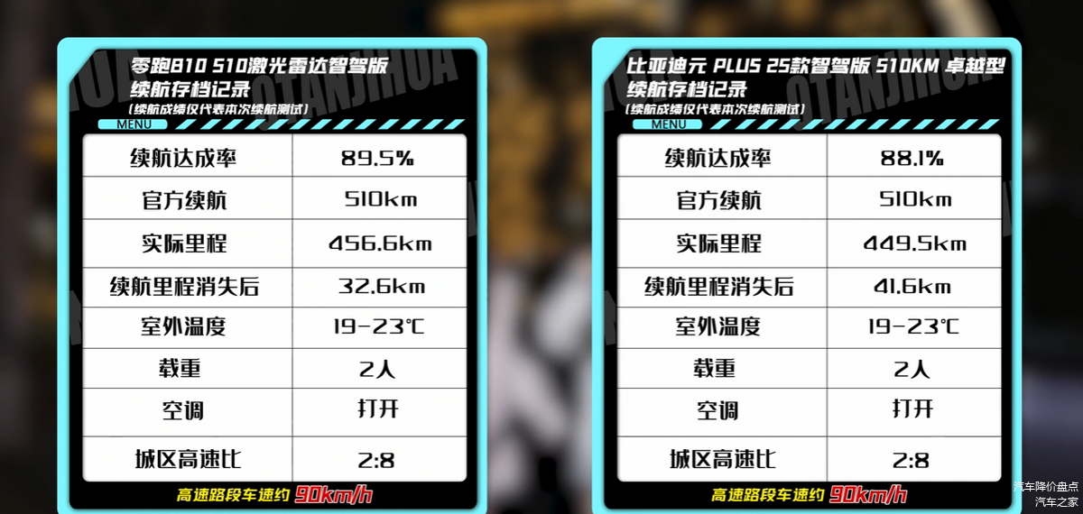 这次对比的结果,可能会让很多人惊掉下巴,作为新人的零跑B10,最终实际续航里程是456.6km,续航达成率为89.5%;而元PLUS续航里程是449.5km,续航达成率为88.1%。从账面数据来看,在续航达成率上,零跑B10竟然还压过了搭载刀片电池的元PLUS。