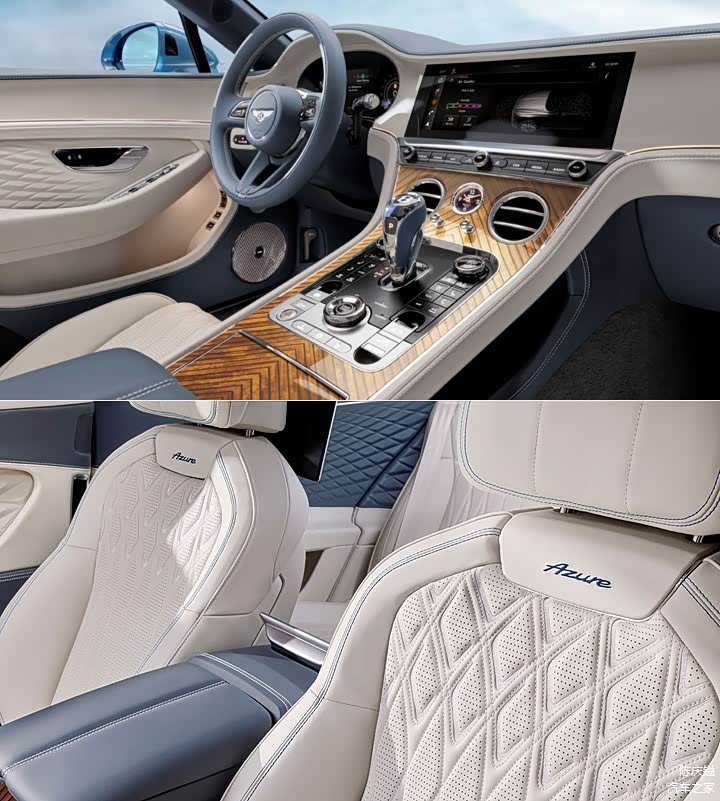 座舱内,Continental GT Azure 和 Continental GT Convertible Azure 的座椅与车门饰板均采用 3D 舒适风格菱形织法,且座椅头枕下方多了「Azure」标志、迎宾门槛饰板亦多了「Azure」标示,且将前座两张健康座椅 (Wellness seating)、消光直纹胡桃木饰板、对比色缝线、旅行 (Touring) 套件、舒适 (Comfort) 配置和氛围灯套件列为标准配备;Continental GT Azure 还配备有全景天窗,Continental GT Convertible Azure 的座椅则是多了颈部加热功能。