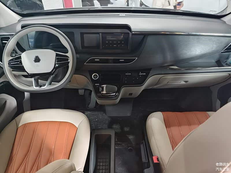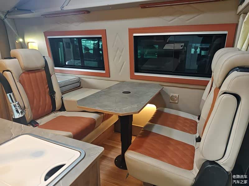 车辆中部是对向设计的座椅,中间的桌子具备升降功能。内饰采用软包材质,颜色进行了统一,米色+深橙色的设计温馨又高端。车窗配有铝合金隐私纱窗,侧壁具备照明灯、充电插座等配置。