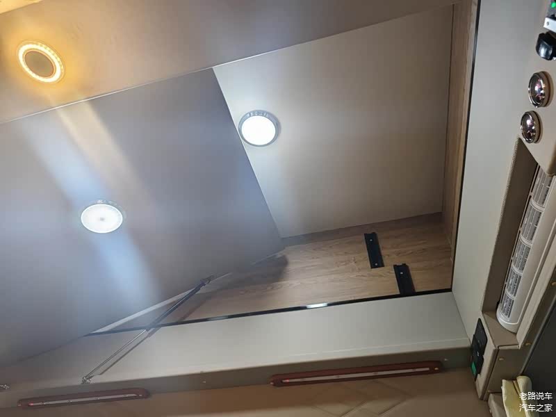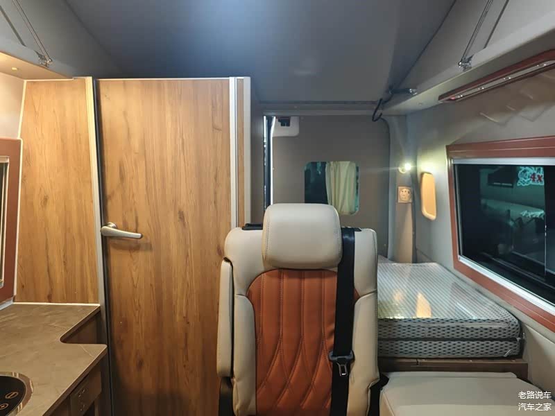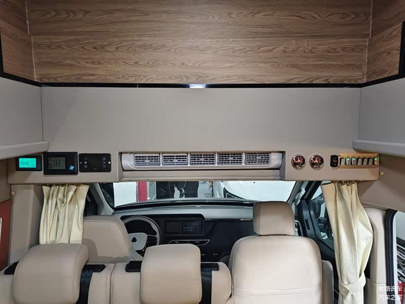 驾驶区与休息区为贯通式的设计,车辆停稳后驾驶员可以直接进入到后方。前部中央空调两侧一端显示电池容量、水温、空调等数据,另一端是升顶控制、氛围灯、户外照明灯等操控按键。
