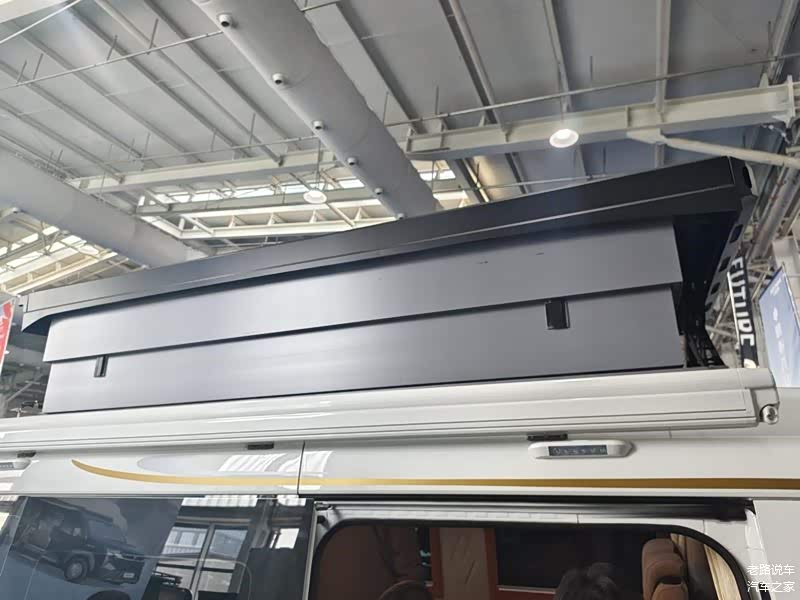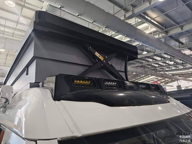 车辆的硬升顶采用电动举升,二层挡板采用堆叠的收纳形式,整个二层的坚固性、隐私性还是有保障的,不过比较可惜的是二层没有设计窗户。在升顶结构的前后两端,各有一个“X”支撑杆用来支撑。在车顶前方还可以看到一排射灯,保证用户在极端环境下的照明需求。