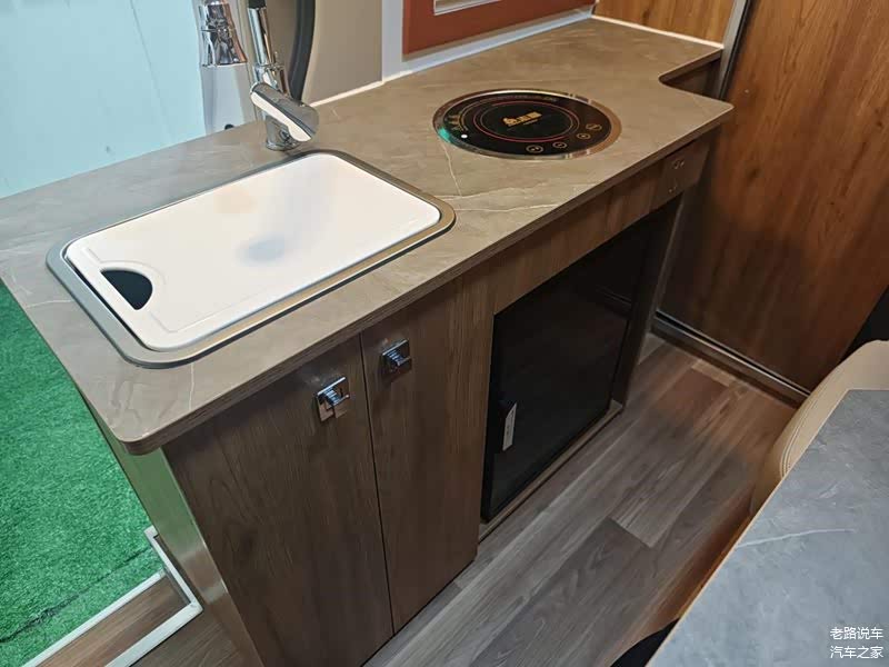 厨房区域有独立水槽、电磁炉以及10L热水器,下方是储物空间和50L车载冰箱,吧台的边缘留有电源插座。这部分还设计有烟雾报警器、二氧化碳报警器,时刻保证车内人员安全。