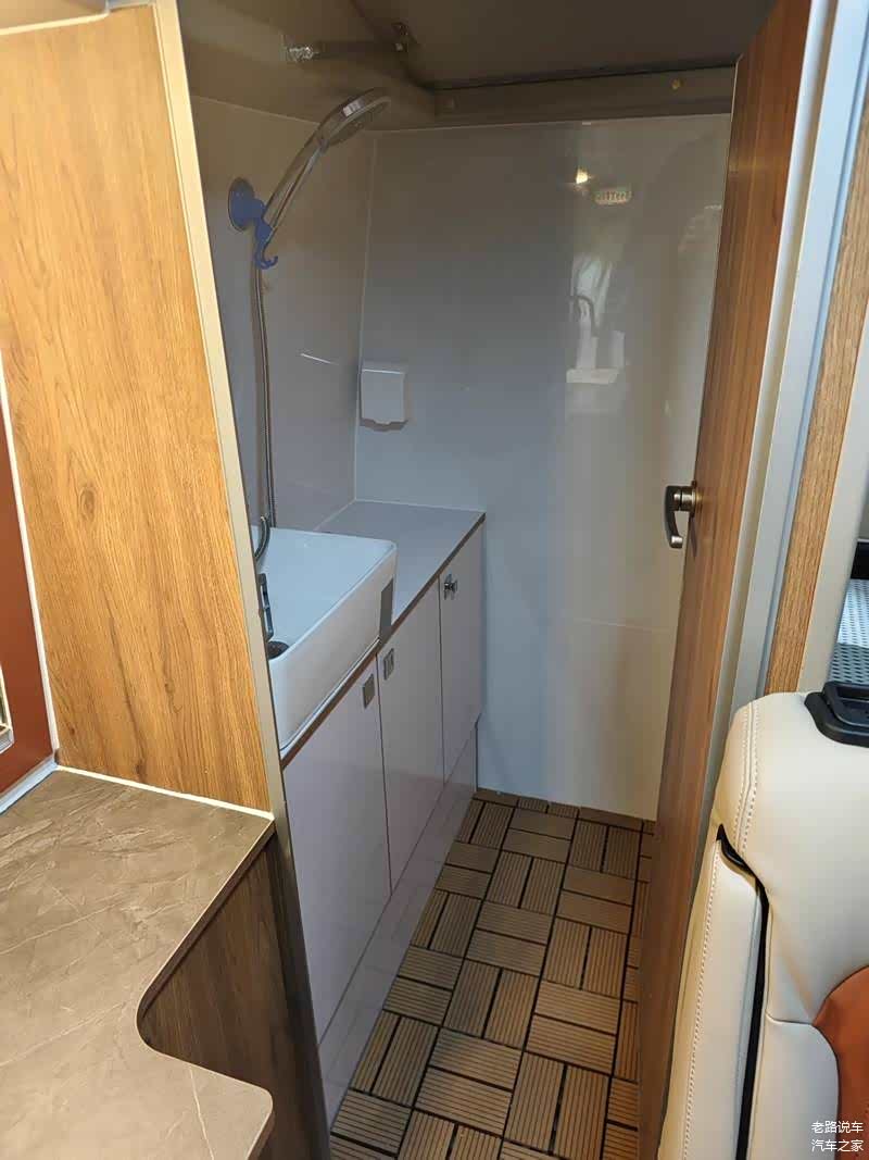 厨房后方是一体式卫生间,下方的地板进行了防滑处理。卫生间具备换气扇、翻折式洗手池、抽拉式花洒等配置,梳妆镜还具备照明灯功能。便携式马桶不使用时可以拿到一旁,以增加洗手间内空间。车辆具备120L清水箱,以及40L灰水箱。