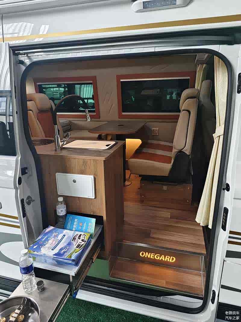 车辆将抽拉式灶台隐藏在了洗手池的下方,用户可以选择在户外料理,减少车内的异味。车内地板采用木纹装饰,阶梯上的“ONEGARD”为车辆的英文名称。