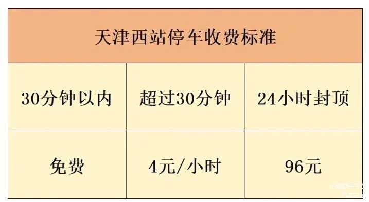 车辆在天津西站停车场停放,前30分钟免费,超30分钟后按每小时4元计费,24小时内最高收费96元。