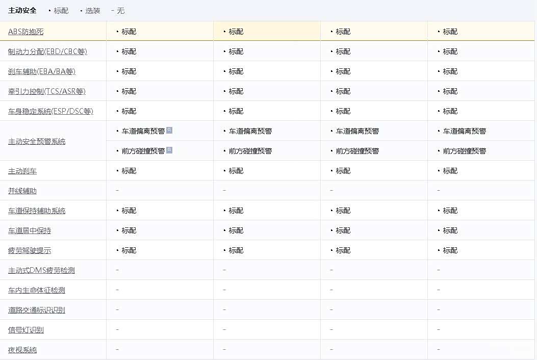 高配才有“真安全”:虽然安全配置“全系标配”,但无钥匙进入、手机无线充电、车载空气净化器需高配车型才有。