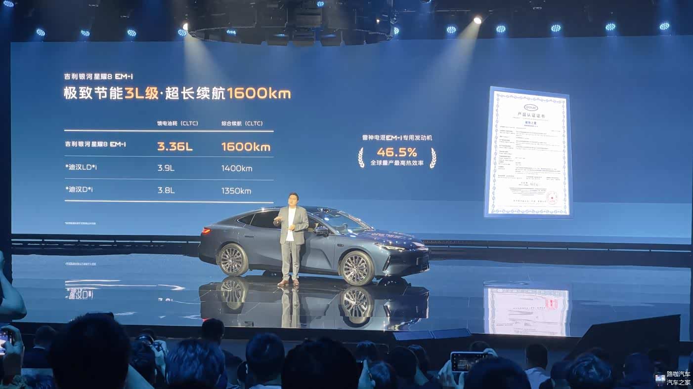 尽管这场预售发布会,吉利银河花了近一半的比重来讲银河星耀8的设计美学,配置、动力、智能、安全等几乎都是一笔带过,但最受关注的其实仍然是那组油耗对比数据。搭载EM-P电混系统的银河星耀8,CLTC百公里馈电油耗为3.67L,CLTC综合续航可以达到1500km;搭载EM-i的银河星耀8,CLTC百公里馈电油耗则只有3.36L,CLTC综合续航高达1600km。作为对比,汉L DM-p的数据为4.6L和1200km,汉L DM-i为3.9L和1400km,汉DM-i为3.8L和1350km。相信大家都非常好奇,能比行业标杆的DM超级混动更省更能跑,吉利银河星耀8的雷神电混到底是如何做到的。