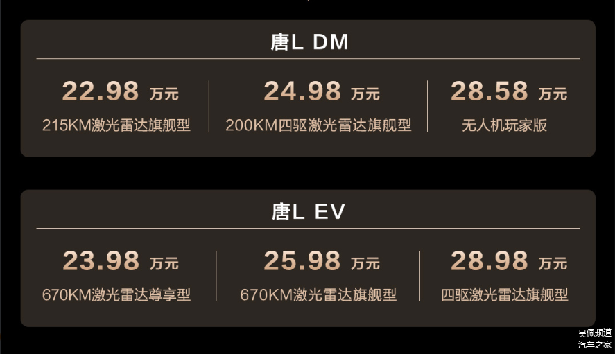 唐L一共推出了两个版本:插混版22.98-28.58万元,纯电版23.98-28.98万元。两个版本各有三个配置,高低配的电池规格一样,差的主要是动力,哪个配置的性价比最高?