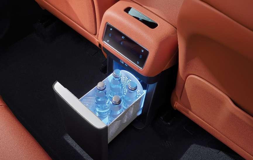 前排和二排座椅也从普通皮质变成了真皮,而且第二排还多出了通风加热按摩,空调从两区升级到三区恒温,第三排也有单独出风口了。关键是,中配开始才给你冰箱,跟空调共用一个压缩机,还是上下双层结构,最低负6度,最高50度的温度调节。这么看来,两万块的升级还是挺全面的。