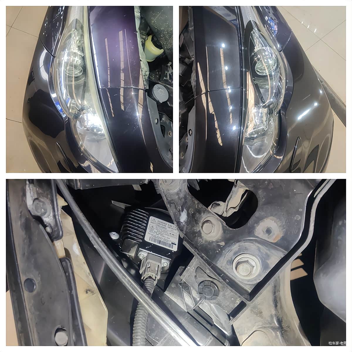 先看事故多发的车头,两边大灯的成色不一样,左边明显新一些,再看固定螺丝和制造日期也不对,大灯框架还有点儿小变形,所以左边应该有碰撞,左边大灯更换了!