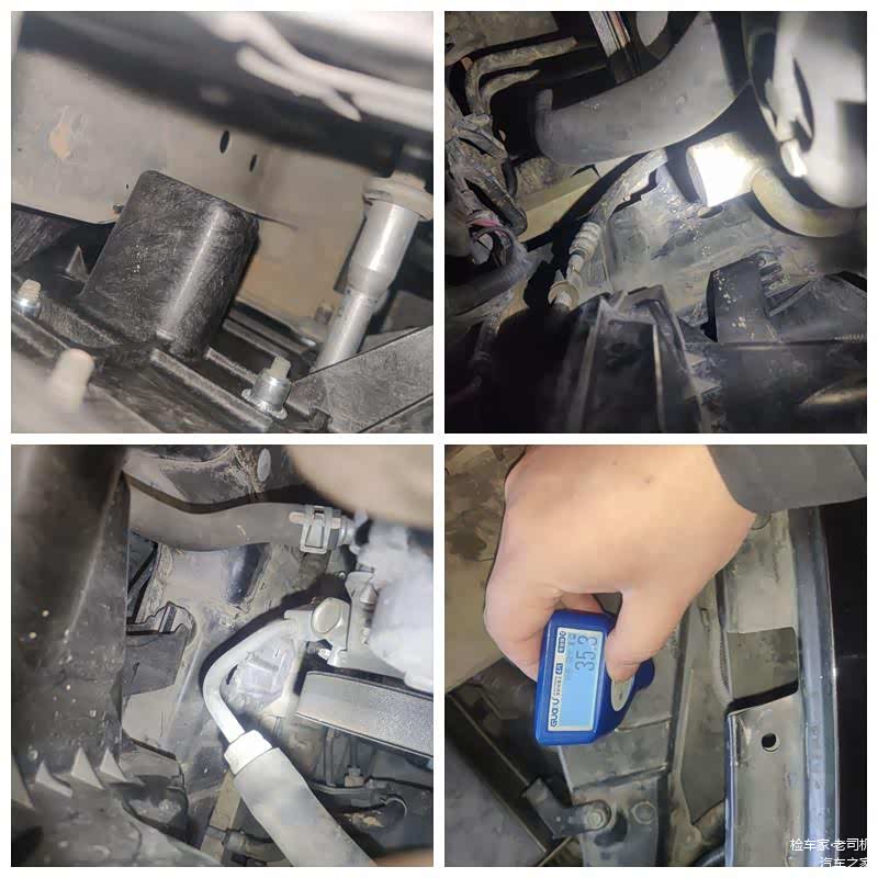 两边纵梁梁头没问题,没有变形维修痕迹,左边翼子板骨架也没问题。这样来看,车头的事故不是特别严重,也就是前嘴一小套的程度,当然,水箱框架更换的话,内饰的安全气囊有可能弹爆,一会儿要留意一下。