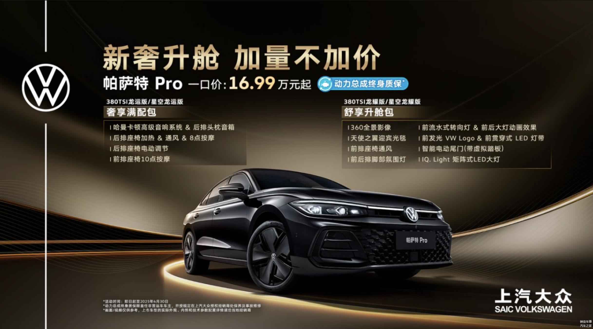 在B级车市场, 帕萨特(图片 | 参数 | 询价)可谓是销量“常青树”。今年一季度其卖出了63,396万辆,稳坐合资B级车销冠宝座。4月10日,上汽大众又增加了这款销量担当的产品矩阵,新增了帕萨特Pro 300TSI龙耀版/星空龙耀版,并且推出一口价16.99万元。