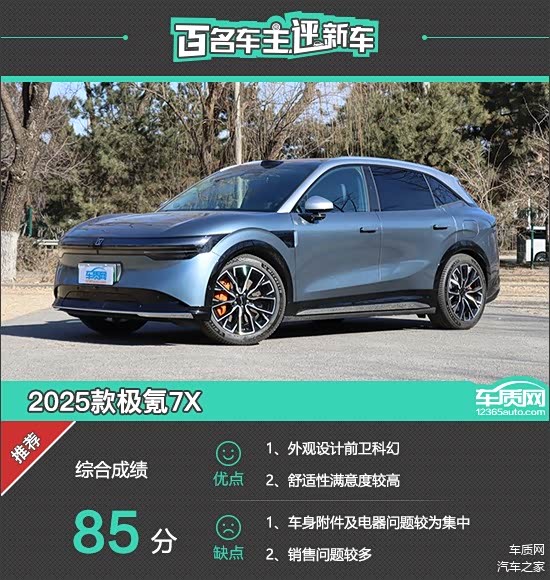 在收集到的102份有效问卷中,根据车主对2025款极氪7X在车型基本面、驾乘感受、使用成本以及质量可靠性、售前/售后服务方面给出的真实评价,在此次调查中2025款极氪7X的综合得分为85分,达到了车质网的推荐标准。