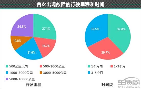 在这些出现非人为故障的车辆中,首次出现故障行驶里程在500公里以内的占比最高,达到27.1%。而对于首次出现故障时间段的调查结果显示,购车1个月内出现首次故障的车主占比相对较高,达到37.8%。