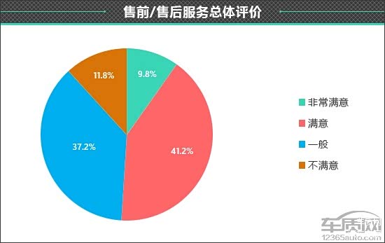 在售前/售后服务总体评价中,接受调查的车主还是给出了客观中肯的评价,其中认为“非常满意”的车主占比为9.8%;认为“满意”的车主占比为41.2%;认为“一般”的车主占比为37.2%,还有11.8%的车主明确表示“不满意”。
