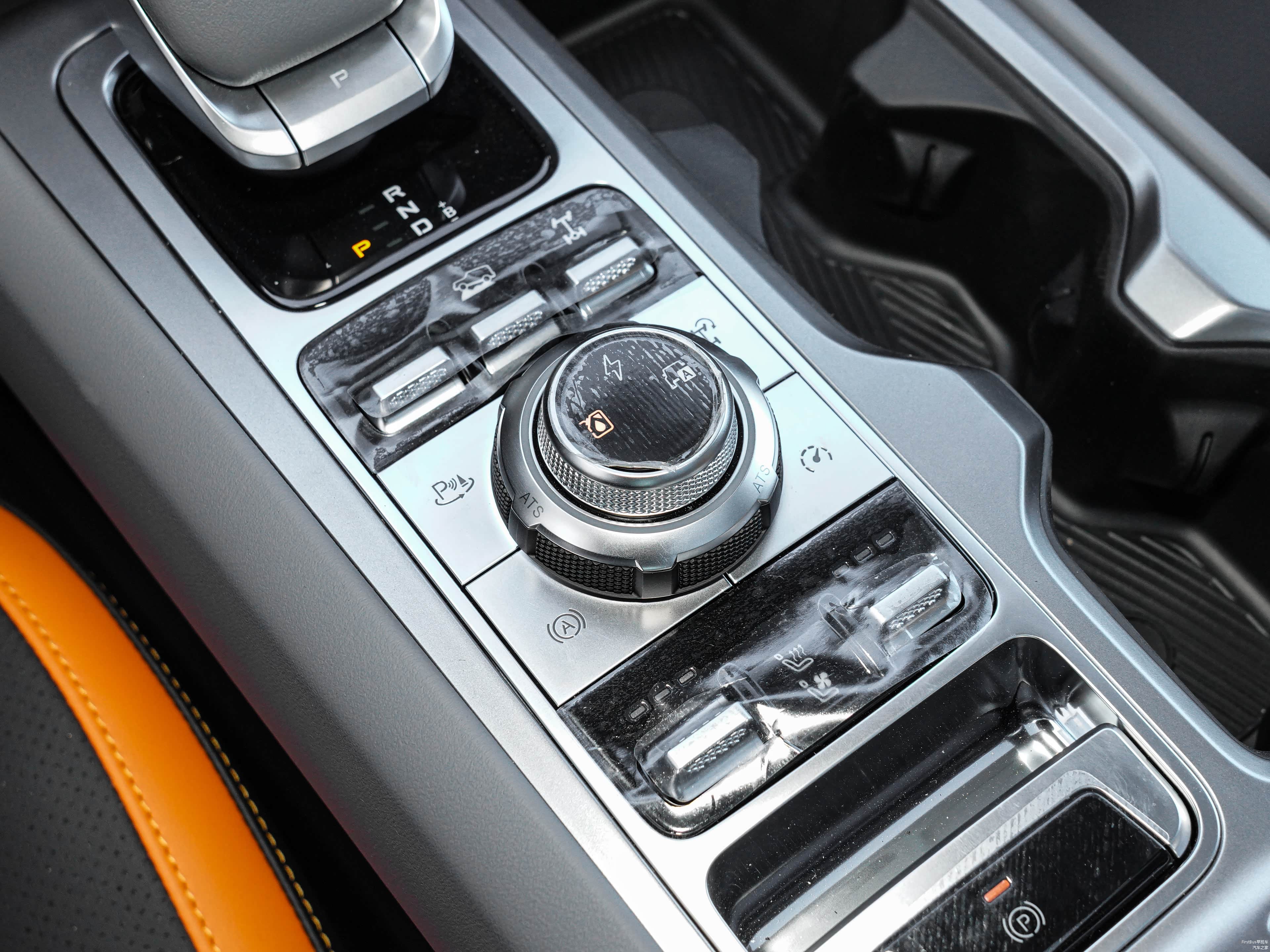 内饰方面,新车延续燃油版车型造型,提供深空晨曦、森林暮影两种内饰色,配备10.25英寸全液晶仪表盘以及双12.8英寸的中控屏和副驾娱乐屏,同时方向盘也采用了全新样式,车机采用高通骁龙8155芯片,支持多屏联动、4G车联网、智能连续语音交互、高德导航、手机互联、华为应用商店、远程APP控车、OTA升级等功能。此外车内还配有许多矩形的元素和在A柱上配备了扶手来彰显其硬朗感。