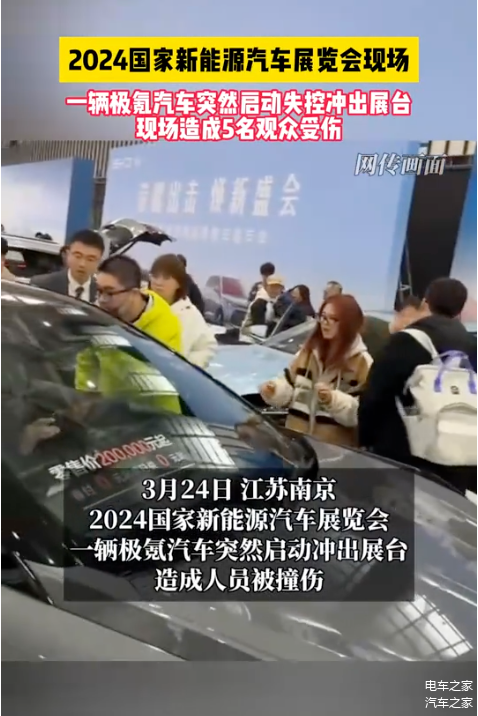 展车失控此前也有类似事件发生。2024年3月24日,在2024南京国际新能源汽车展览会上,极氪车辆突然启动撞伤多人。 后经过极氪回应得知,原因是未按规定开启展车模式,处于驻车舒享模式且汽车钥匙在有效使用范围内。