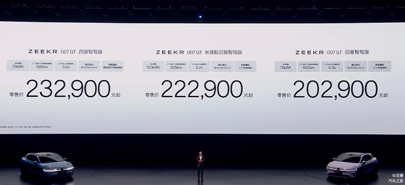 在动力配置上,007GT采用了800V的设计架构,它的单电机后驱版本的峰值功率达到了310kW。四驱版本的车型搭载了165kW的前电机和310kW的后电机,整体系统功率为475kW,其最高行驶速度可以达到210km/h。我们为客户提供了75kWh和100kWh两种不同的电池选项。CLTC的电池续航能力分别达到585km、650km、730km和825km,其最大充电功率可以达到500kW。SOC的10%-80%的充电时间仅需10.5分钟,这一数据充分证明了极氪在充电技术方面具有明显的优势。