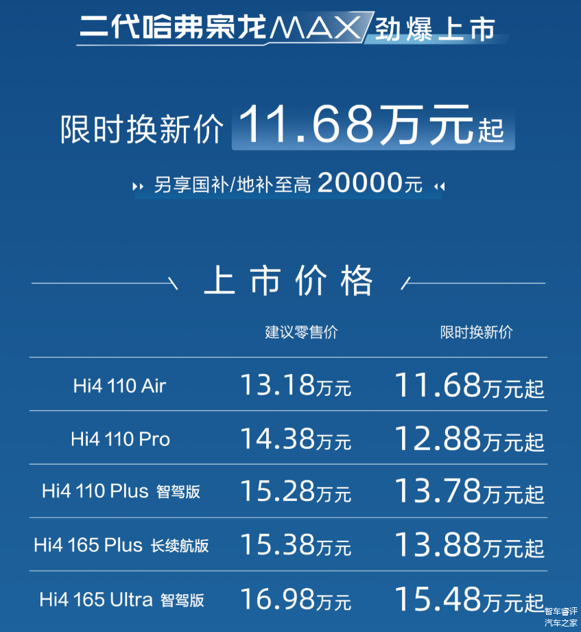 4月16日,长城的二代哈弗枭龙MAX正式上市了,一共五款车型,售价区间13.18万~16.98万元。不过最炸裂的是,在5月31日之前消费者可以享受限时换新价,也就是说,最低11.68万元就可以买到110km纯电续航,并配有电四驱的插电混动中型SUV,性价比简直惊人。