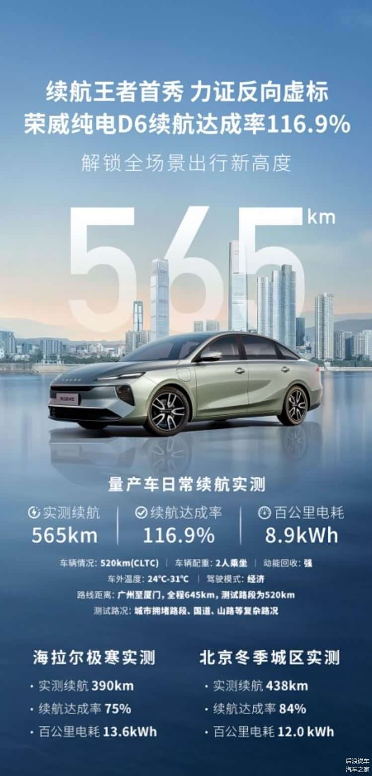 而在最近的量产车首测中,在20℃初春环境下,荣威纯电D6续航达成率116.9%,做到了反向虚标。
