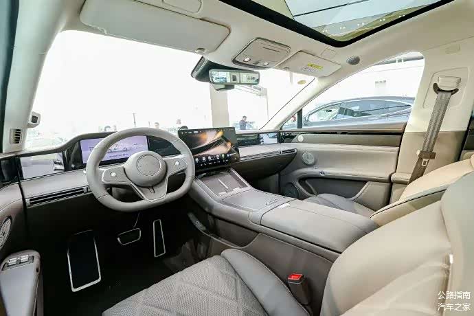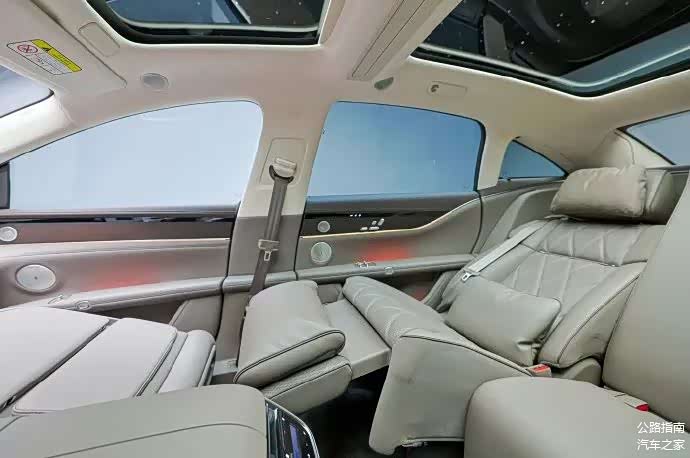 享界S9增程版内饰采用星环双露台设计,带来全新方向盘样式,标配Nappa真皮、全车舒云座椅、全向隐私遮阳帘、通风/加热/按摩,后排配备零重力座椅、9英寸屏幕、小桌板和车载冰箱。