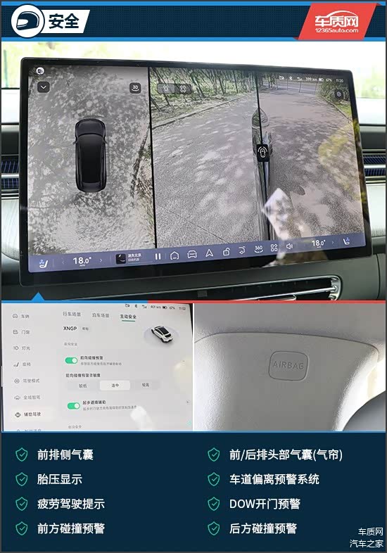 安全配置方面,评测车不仅配备了6个安全气囊、胎压显示、车道偏离预警系统、主动刹车/主动安全系统等同级别车型常见的功能,还提供了疲劳驾驶提示、DOW开门预警、前方碰撞预警、后方碰撞预警、内置行车记录仪等实用功能,整体配置表现令人满意。