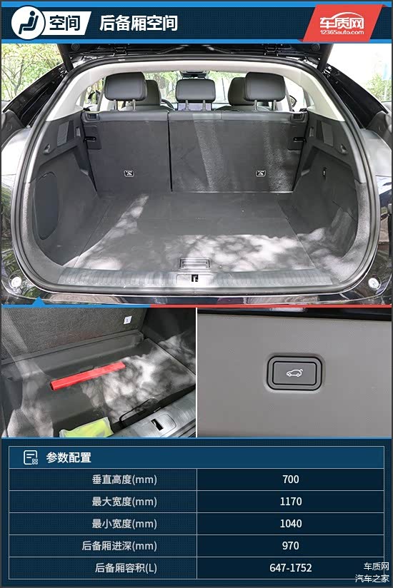 后备厢开口面积较大,内部造型也十分规整。常规状态下,官方公布的后备厢容积为647L。如果将后排座椅全部放倒,最大容积可达1752L,足以满足日常使用需求。