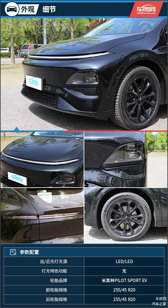 评测车选装米其林PILOT SPORT EV系列轮胎,采用Acoustic静音技术,可以有效降低车辆行驶噪音,轮胎规格为255/45 R20。