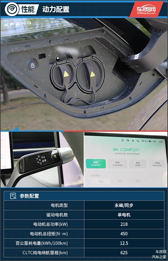 2025款小鹏G6全系标配800V高压碳化硅平台和5C超充AI电池,电池电量从10%至80%补能时间只需12分钟,效率相比老款显著提升。评测车搭载后置单电机,电动机总功率和总扭矩分别为218kW和450N·m,匹配容量为68.5kWh的磷酸铁锂电池,CLTC纯电续航里程达到625km。