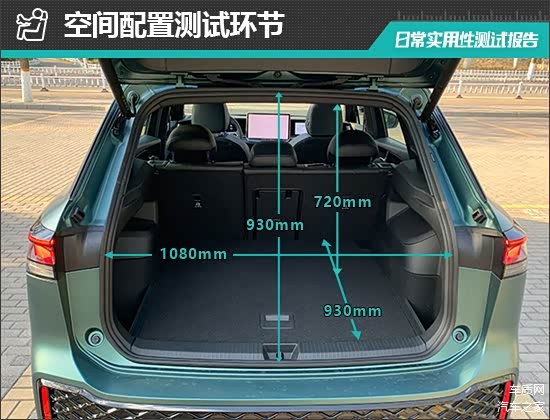 后备厢内部空间十分规整,空间利用率相当高。同时,后排座椅支持4/6比例放倒,扩展能力出色。对于评测车后备厢的基础数值,我们也进行了实测,开口长度为930mm;开口宽度为1080mm;后备厢进深为930mm;后备厢地台与顶部的垂直高度为720mm。