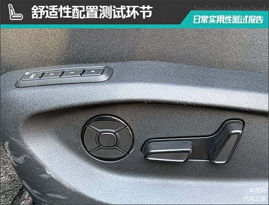 座椅方面,评测车主驾驶座椅电动调节按键位于座椅侧面,调节按键位置合理。此外,评测车驾驶位座椅支持三组记忆功能,前排座椅选装三档加热功能,舒适性配置较好。