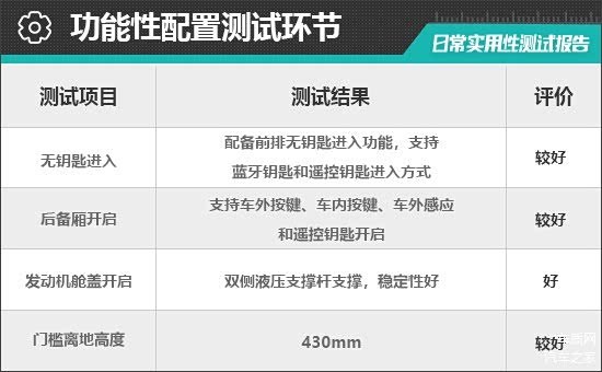对于消费者来说,门槛离地高度一定程度上决定了上下车便利性。根据实测结果来看,评测车的门槛离地高度为430mm,达到同级别车型平均水平,驾乘人员日常上下车较为便捷。