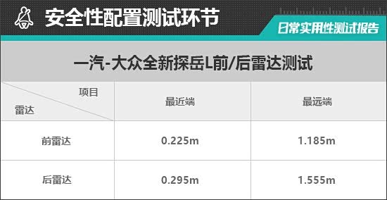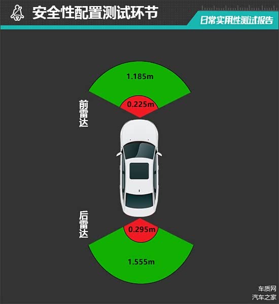 在雷达测试过程中,评测车的后雷达最远可在1.555m处感应到后方物体,后雷达功率表现不错。从实测数据来看,后雷达持续蜂鸣阶段最近距离为0.295m,表现未达到同级别车型平均水平。