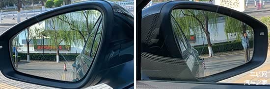 评测车的左侧外后视镜采用双曲率镜片,右侧外后视镜为普通镜片。经实测,左侧视野范围为27.1°,右侧视野范围为18.8°,在测试过的同级别车型中分别处于中上游和中下游水平。