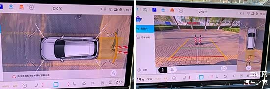 评测车配备了360度全景影像,方便驾驶员查看车辆周边情况。影像清晰度可以让人满意,车辆周围的畸变控制也比较好。同时,该影像还提供可随动转向的辅助线和多视角查看,日常便利性可以令人满意。