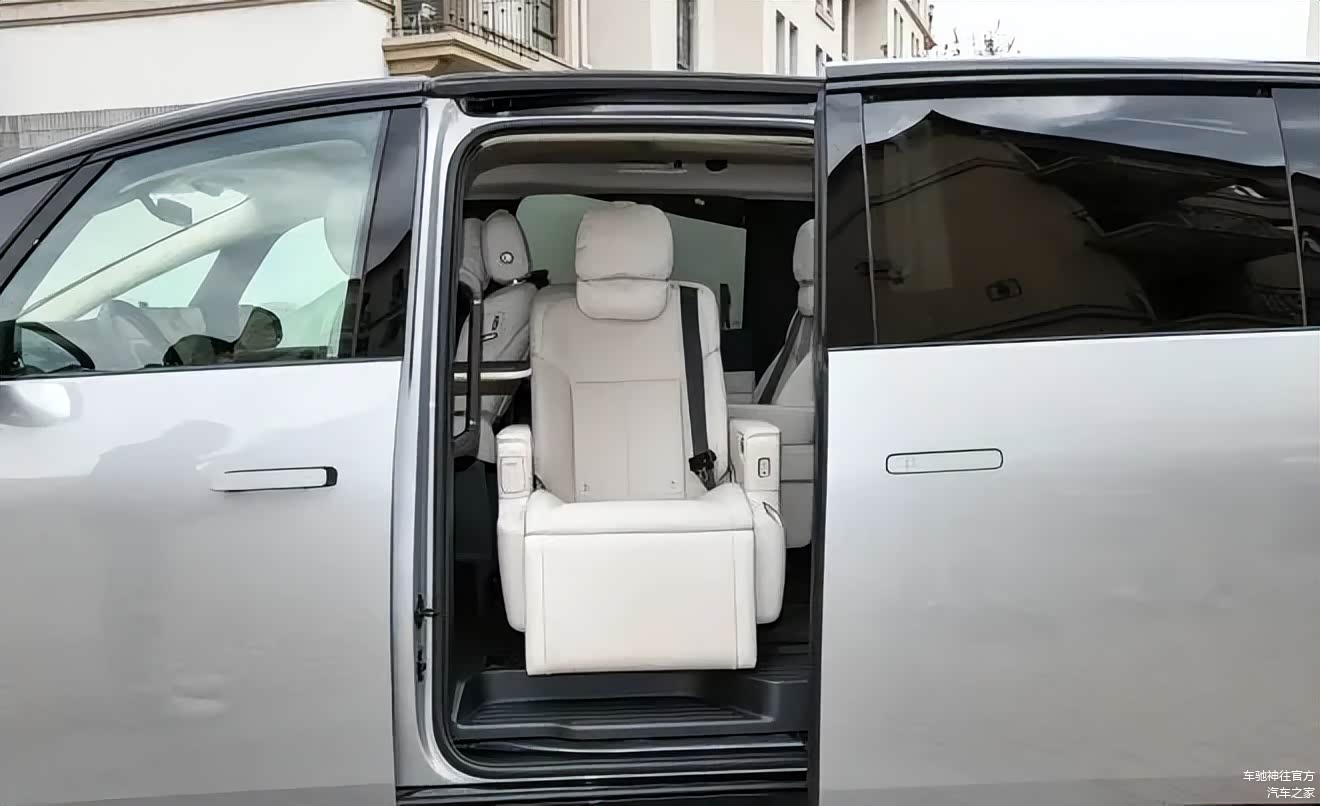 相较于在售款车型,新车最大的亮点在于第二排配备旋转零重力座椅。二排零重力座椅可 45°、90°、180° 旋转,有露营等多种情景模式,还支持充分躺倒、四向腿托、18 点热石揉捏按摩、座椅加热通风等舒适功能。此外,座椅扶手上的按键布局做了调整,USB接口改至前端位置,吸顶屏尺寸从 17 英寸增大到 21.4 英寸,采用 3K LCD 屏,而且还升级了前排电吸门。
