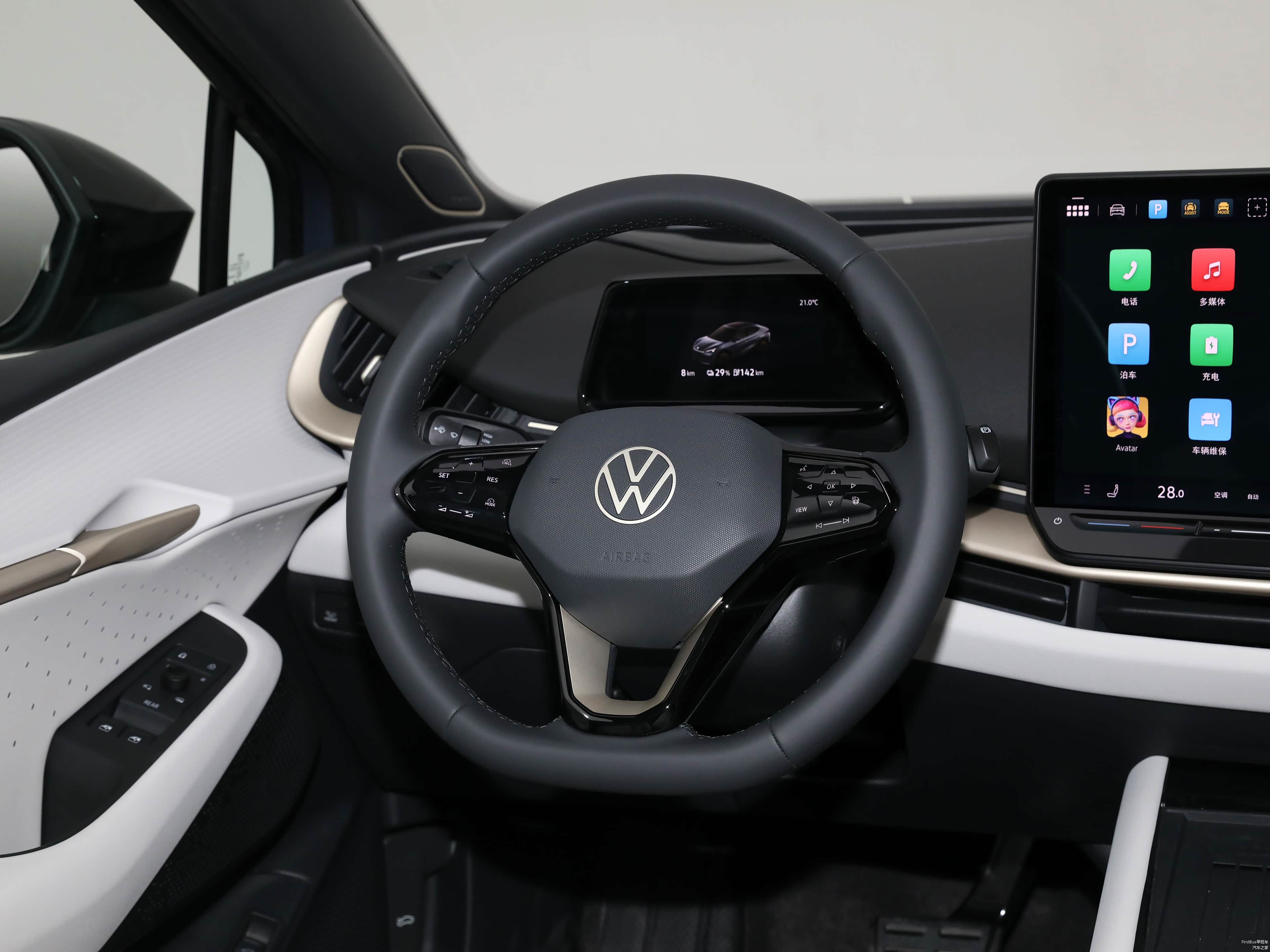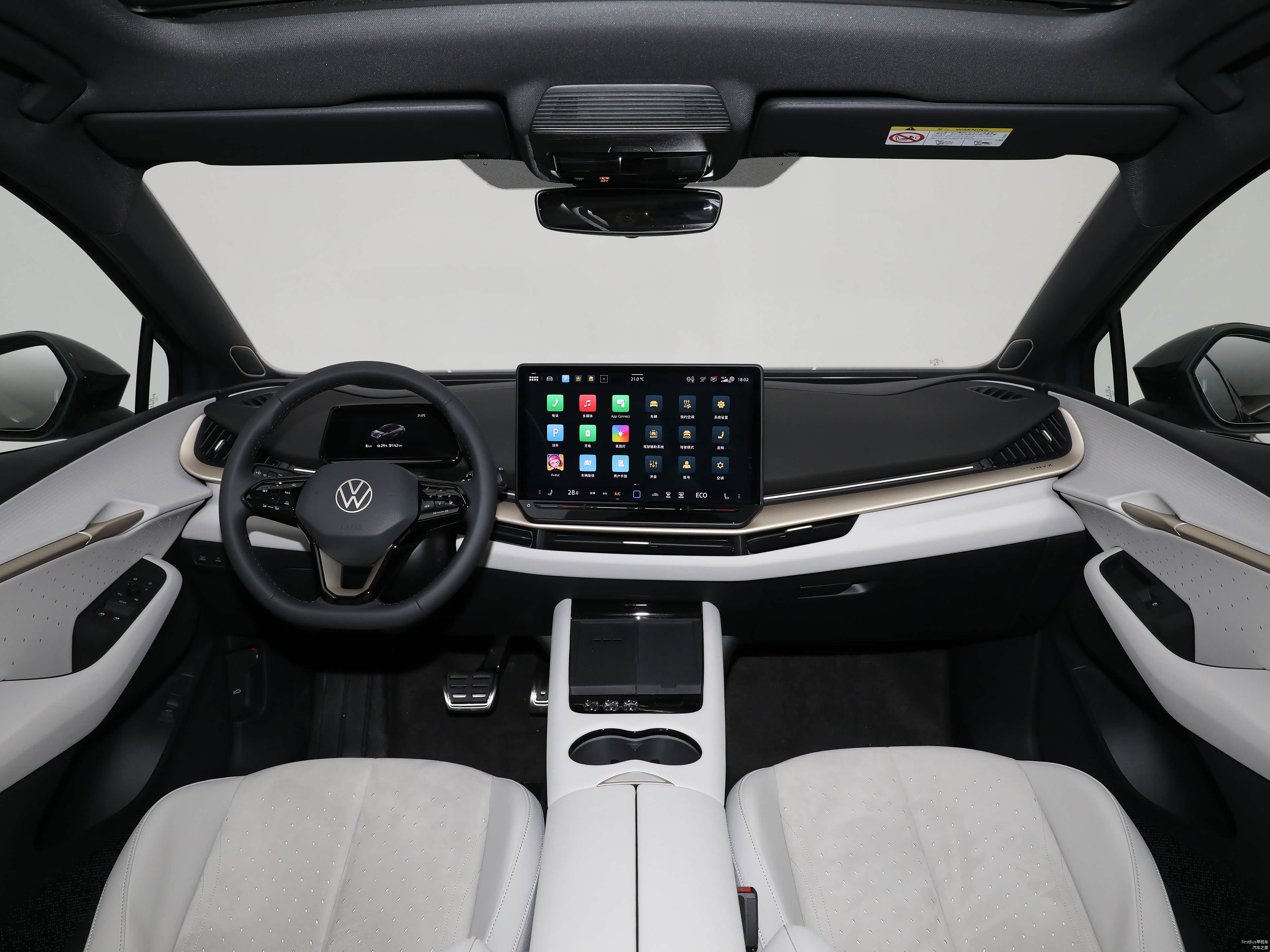 内饰设计比较个性时尚,提供仲夏黑、雪月白两种内饰配色,配备平底式方向盘、悬浮式仪表盘以及15英寸悬浮式中控屏,内饰细节还加入了金色装饰件,凸显质感。新车还搭载大众最新ID.S 5.4车机系统,支持CarPlay/CarLife/华为HiCar、AI智能伙伴、UNYX智能导航、UNYX智能语音交互、智能场景模式、在线音乐/音频/视频、游戏中心、车载KTV、车载应用商城、车载小程序、手机远程控制、OTA升级等功能,进一步提升车辆的科技感。