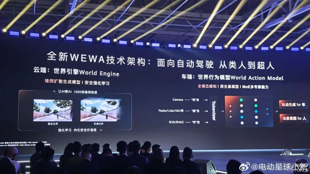 除了云端,车端的 WEWA 部分叫做「世界行为模型 World Action Model」。WAM 主打的功能点有三个:全模态感知、原生基模型,以及 MoE 多专家能力。
