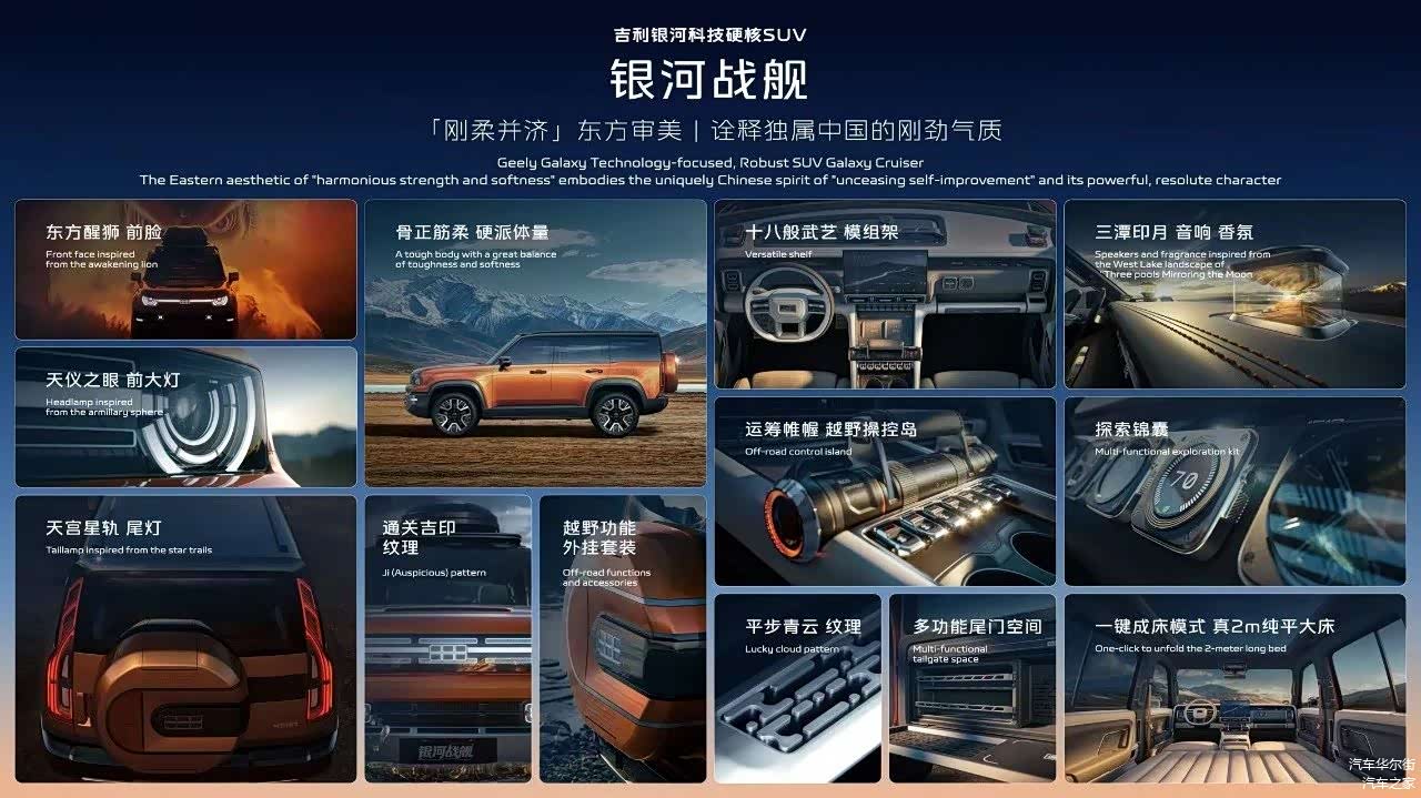 车展上,吉利智能安全科技的集大成之作 —— 银河战舰全球首发。这款科技硬核 SUV 原型车在设计上融入了独特的东方美学元素,前大灯形似 “浑天仪”,尾灯勾勒出 “天宫星轨”,越野操控岛灵感源自 “游艇操纵杆”,展现了吉利银河 “涟漪美学” 在智电时代的硬派风格。