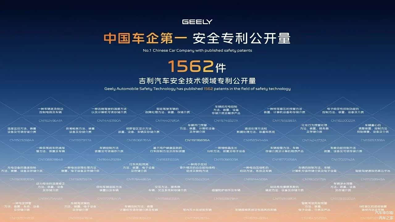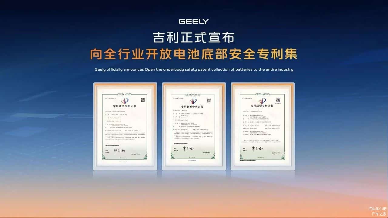 在安全专利方面,吉利表现卓越。根据中汽中心公布的数据,吉利以 1562 项安全专利公开数位列中国车企第一。吉利认为安全专利不应是企业的 “私藏”,而应成为全行业共享的财富。针对电池新国标增加的底部碰撞试验,吉利将向全行业开放包含电池包底护板专利、电池包防撞梁专利、底部碰撞实验装置专利在内的电池底部安全专利集,为行业提供从整车电池安全设计到技术验证的系统性解决方案。