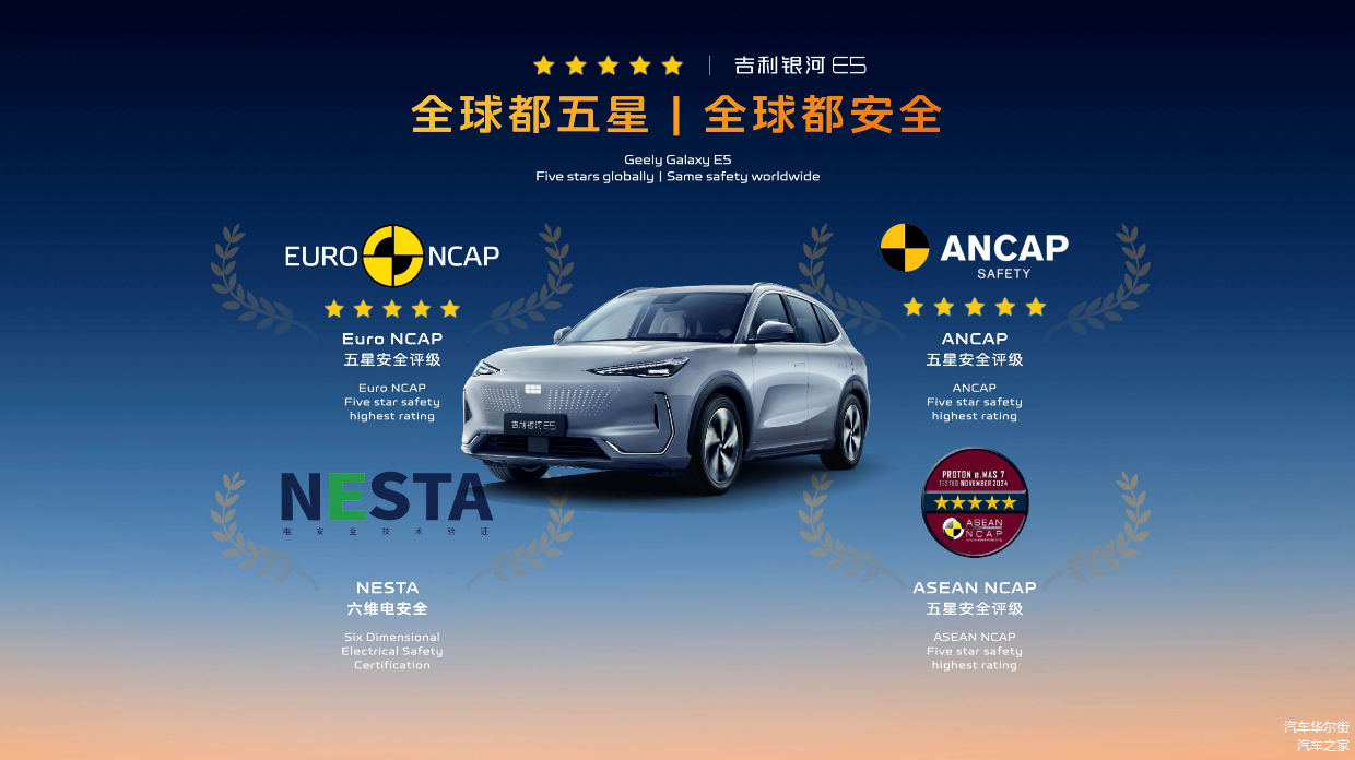 吉利造车近 30 年来,始终把“安全第一” 作为开发战略,构建了行业领先的安全开发体系,并将成果广泛应用于旗下车型。例如,基于神盾电池安全系统的吉利银河 E5,获得欧洲 Euro NCAP 和澳洲 ANCAP 双 “五星安全” 最高评级,在同类型测试中综合成绩排名中国品牌第一 ,还在 Euro NCAP 实验室完成了 50km/h 中心柱碰挑战,成为 15 万级纯电车中的佼佼者。