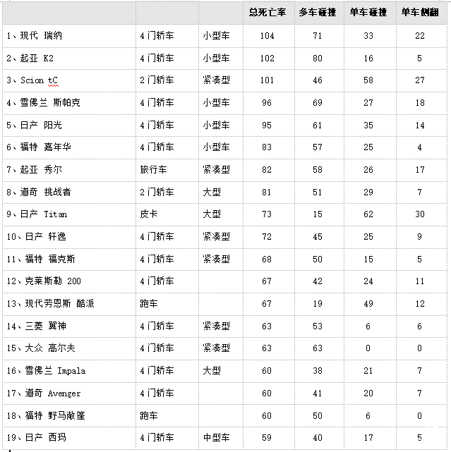不是媒体瞎说,数据确实是真真实实摆在你面前,不得不承认,车型级别越高越安全,而且从上面这个表里就能看到小型车和紧凑型车死亡率最高,19款车里占了13款。