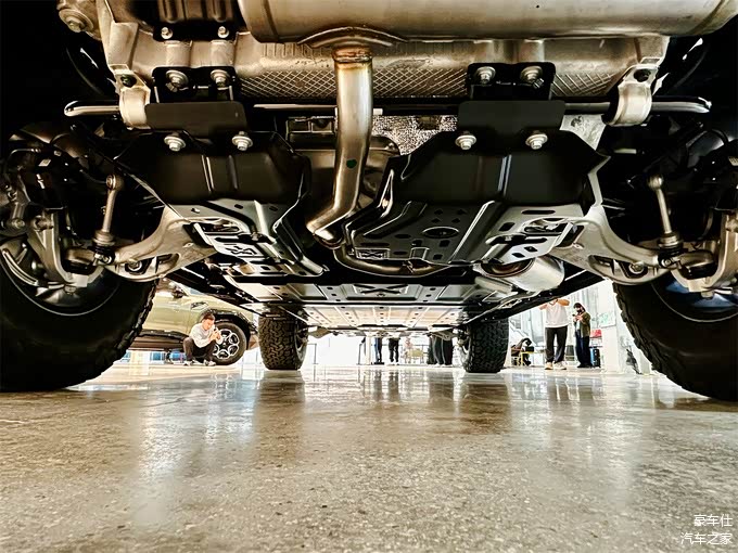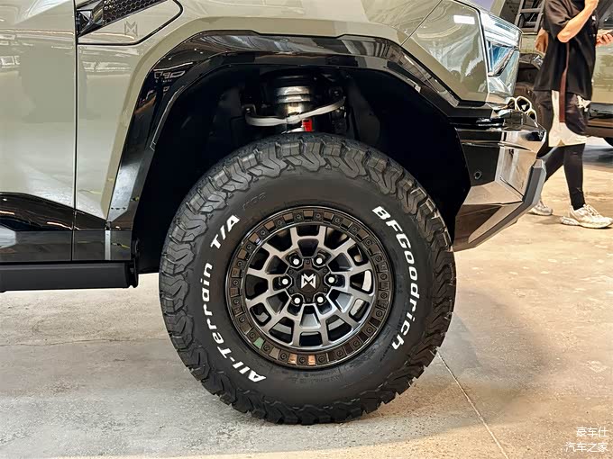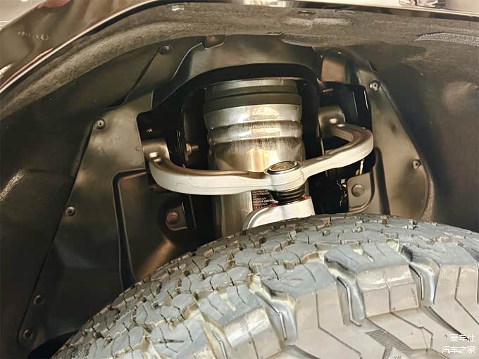 同样的,车身侧面也采用了大量凌厉的线条和锋利的型面进行塑造,让整台车看上去更加具有力量感。我们今天实拍的这款车配备了AT全地形轮胎,悬架高度也被调整到了最高的位置,不仅看上去高大威猛,整车的通过性也有一定的保证。