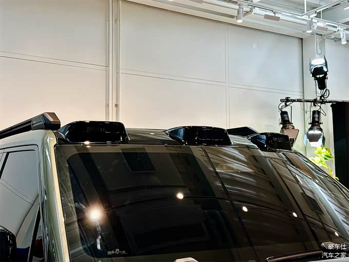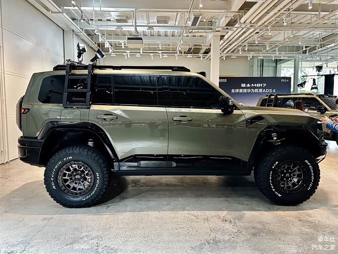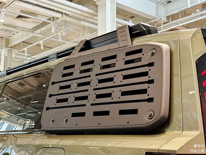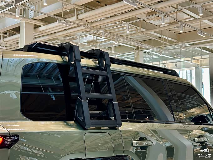 当然,作为一款硬派越野车,拓展功能的丰富程度也很重要。实拍车型在后方还分别配有越野用具的拓展板和爬梯,上方还配有结实的行李架以用来做进一步的空间拓展,这一点对于越野爱好者来说就很方便。