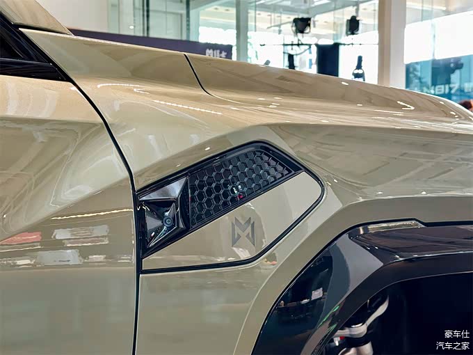 从外观来看,猛士M817基于雄魂美学2.0打造,它以东方醒狮为灵感,将硬核军工范儿与未来科技相融合,构建出了这样一台视觉“猛兽”。如果我们来看细节的话,这款车车头部分最吸睛的便是这个狮吼格栅了,六边形的结构被放大到近乎夸张的比例,内部还能看到提升运动感的熏黑处理,搭配上可发光的猛士狮标,这颜值和辨识度在行业里都是难得一见的。