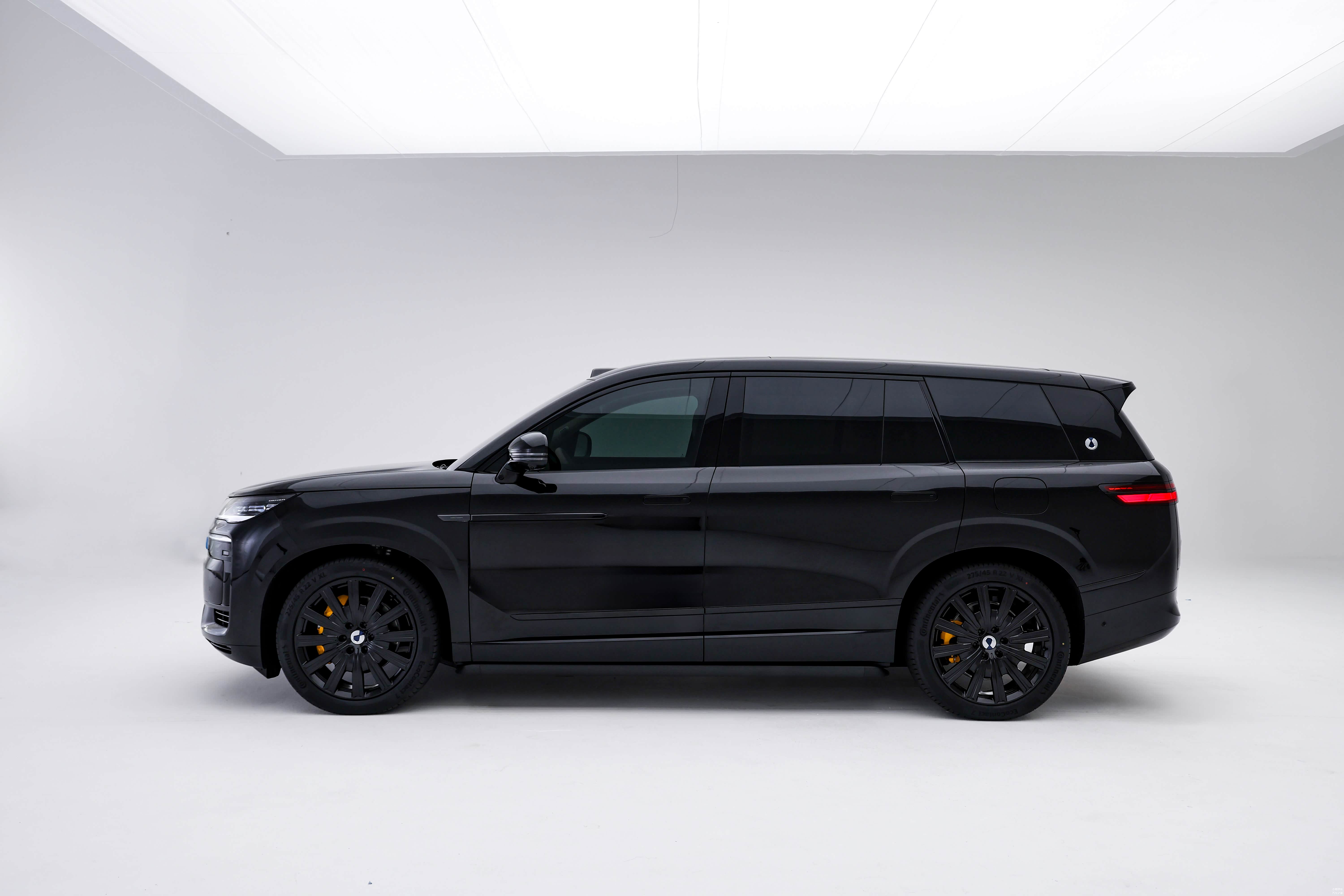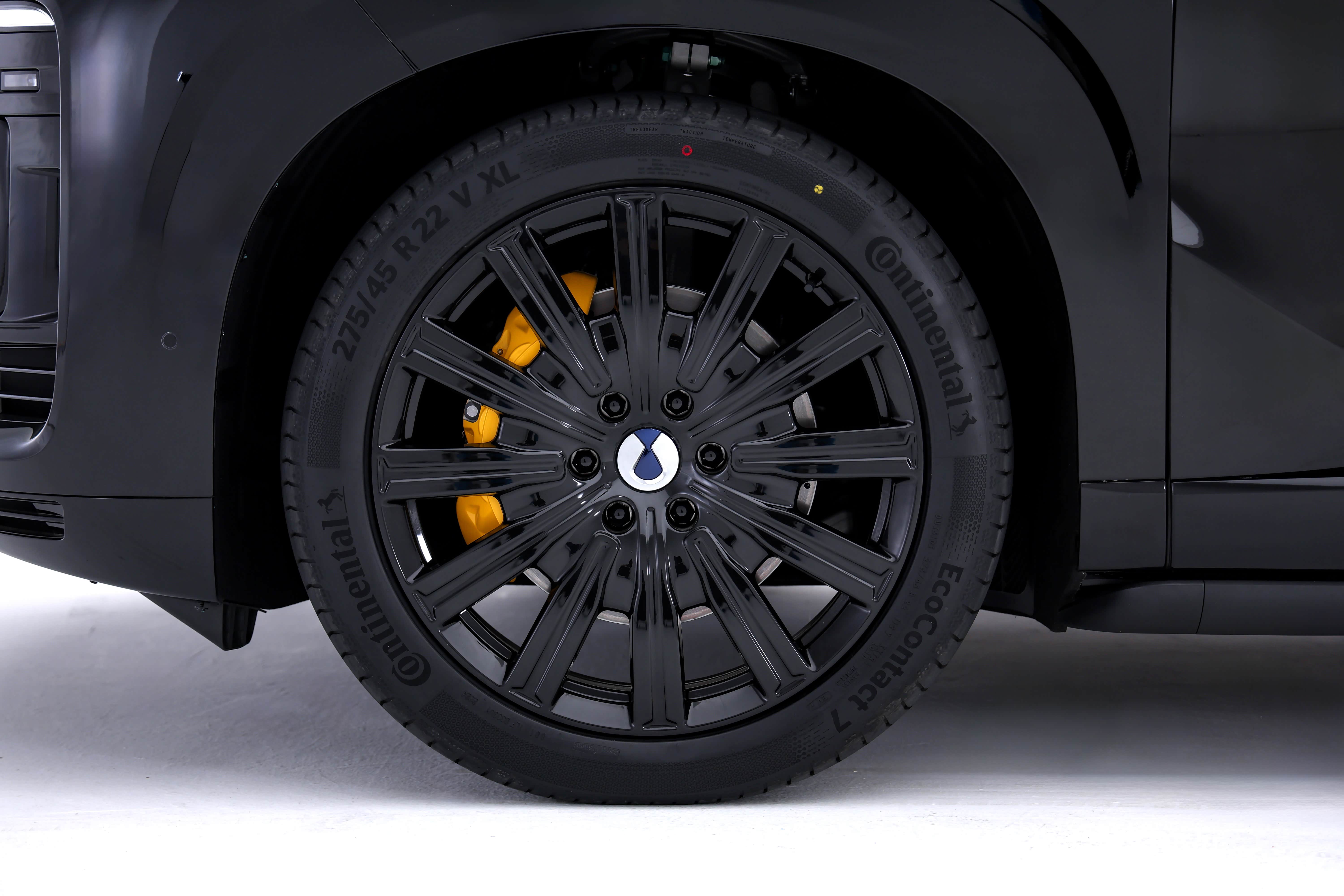 尾部最突出是贯穿式灯组,造型细长,与前大灯组呼应,内部灯组呈现梯形样式,设计灵感源自于中国古代建筑中的窗棂。配备了22英寸轮圈,尺寸275/45 R22,还提供22英寸轮毂+六活塞刹车卡钳选装。